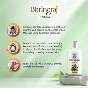 1. Take sufficient quantity of Bhringraj Thailam and apply it to the scalp and hair.