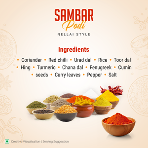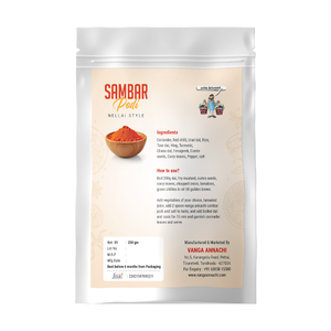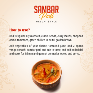 How to use: Boil 200g dal, Fry mustard, cumin seeds, curry leaves, chopped onion, tomatoes, green chilies in oil till golden brown. Add vegetables of your choice, tamarind juice, add 2 spoon Sambar podi and salt to taste, and add boiled dal and cook for 15 min and garnish corinader leaves and serve.